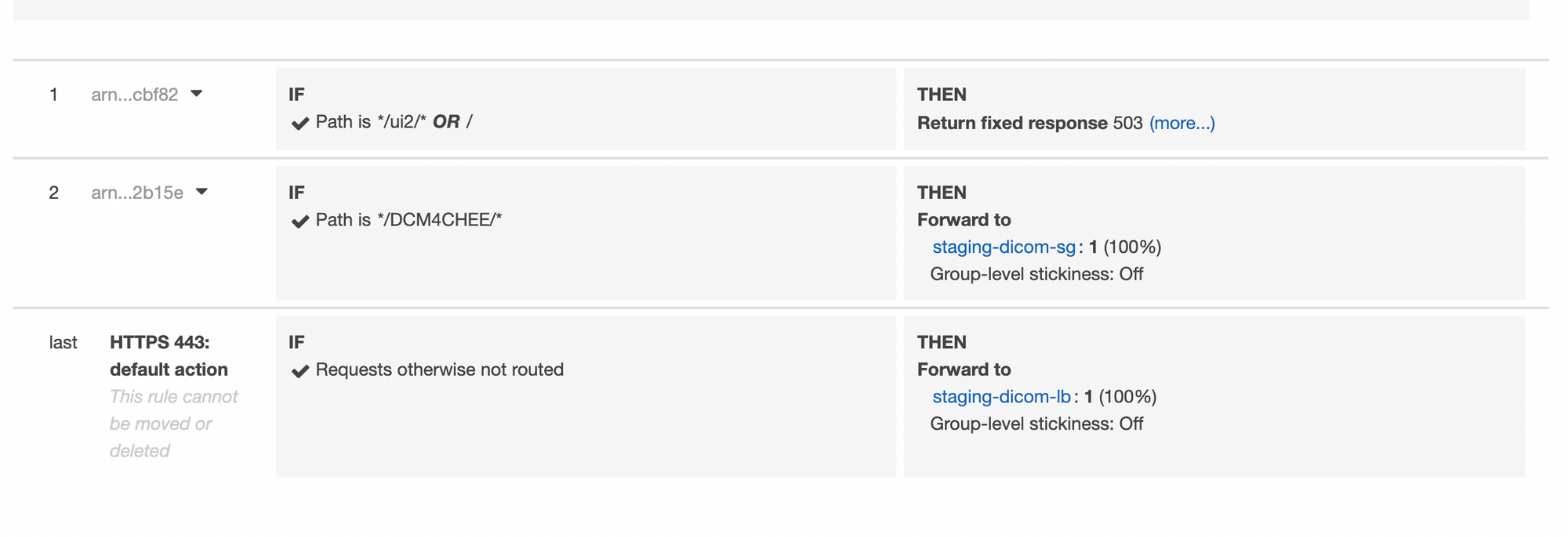 A loadbalancer was setup pointing to the staging ec2 instance with the following rules. We set out to replicate this using a reverse proxy and eliminate the AWS loadbalancer.